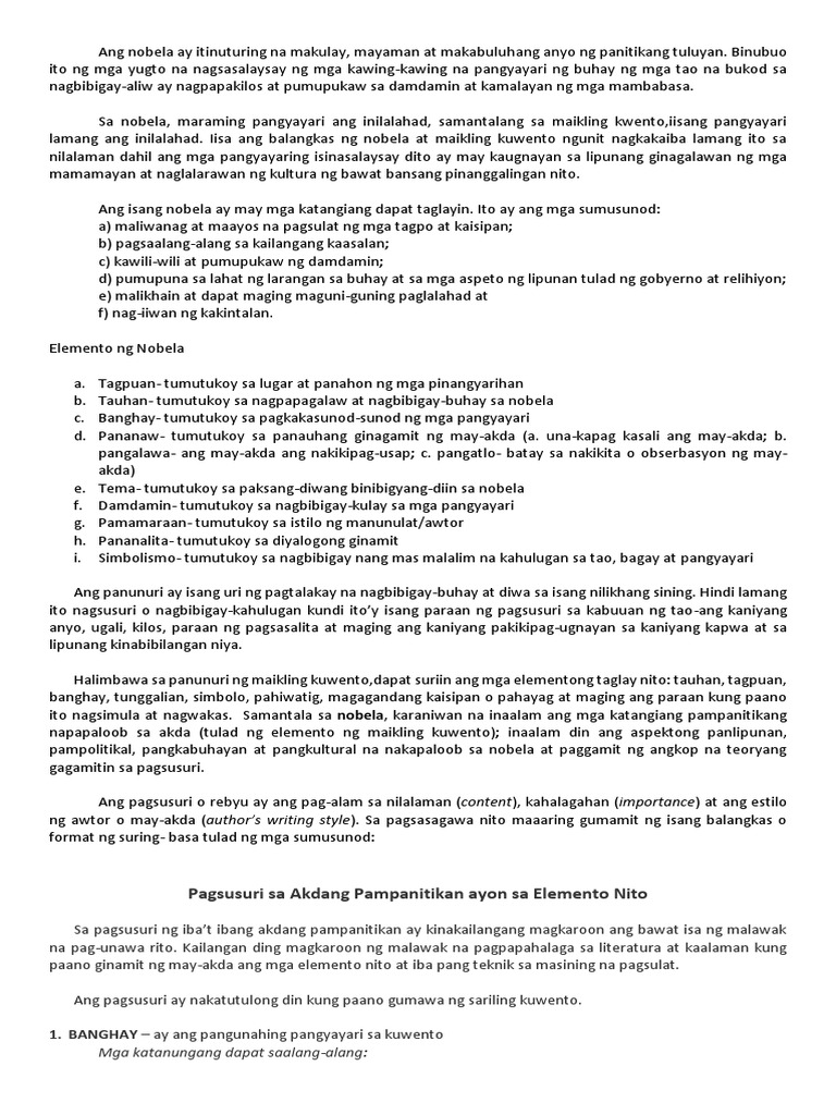 Ang nobela ay isang bungang-isipkatha na nasa anyong prosa kadalasang halos pang-aklat ang haba na ang banghay ay inilalahad sa pamamagitan ng mga tauhan at diyalogoitoy naglalahad ng isang. Isang uri ng lagom na kalimitang ginagamit sa mga akdang nasa tekstong naratibo tulad ng kuwento salaysay nobela dula parabula talumpati at iba pang anyo ng panitikan. Una kailangan mong basahin ang buong kwento o teksto.