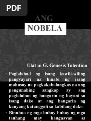 Sa pangkalahatan ang Nobelang Pilipino o Nobela sa Pilipinas ay ang mga nobelang nalimbag sa Pilipinas na inakdaan ng mga may-akdang Pilipino tungkol sa mga Pilipino at sa Pilipinas. C E Publishing 2006. HALIMBAWA NG NOBELA Sa paksang ito tatalakayin natin kung ano nga ba ang tinatawag na nobela.